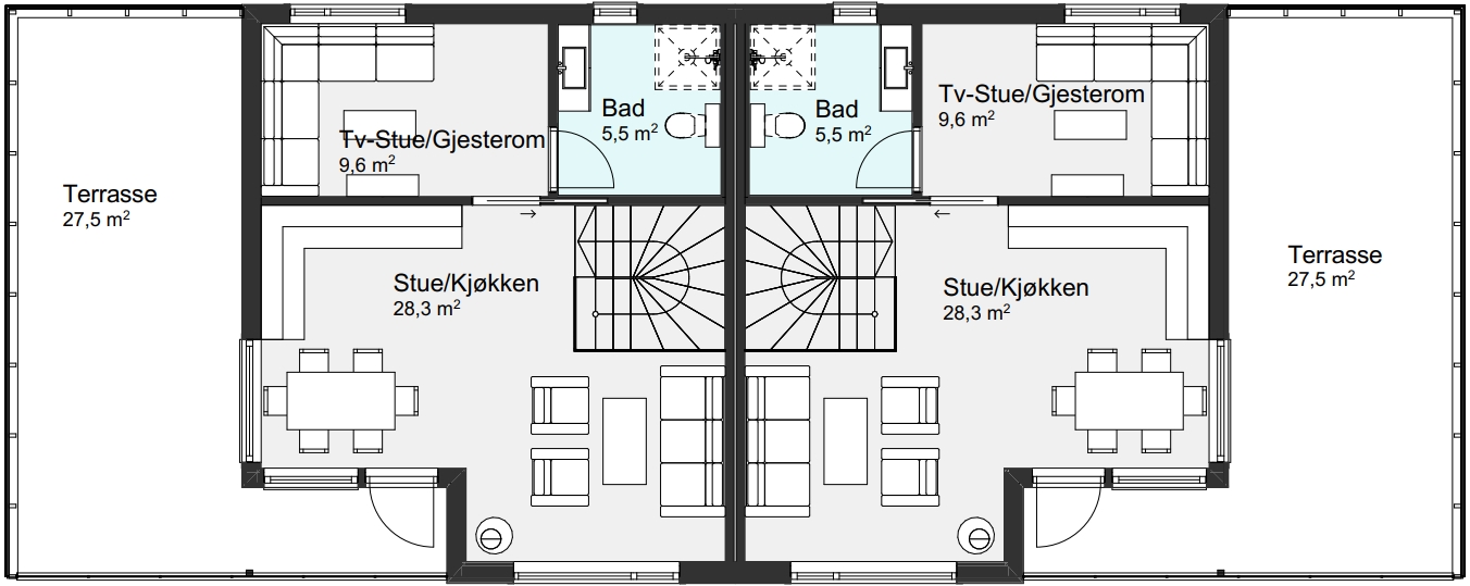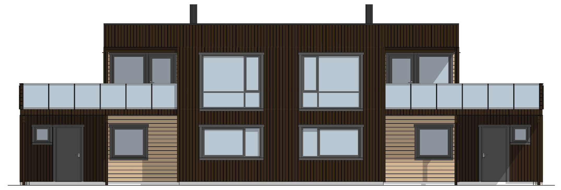 Bolig 1103 er en vertikaldelt tomannsbolig som egner seg for skrå tomter. Det er to soverom i første etasje og ett soverom/TV stue andre etasje. Fra kjøkkenet har du tilgang til en stor veranda på nesten 30m2. Boligen har egen carport, sportsbod og inngangsparti som er plassert under veranda. Noe som gir god skjerming mot vær og vind ved boligens inngangsparti.