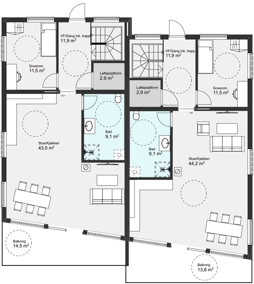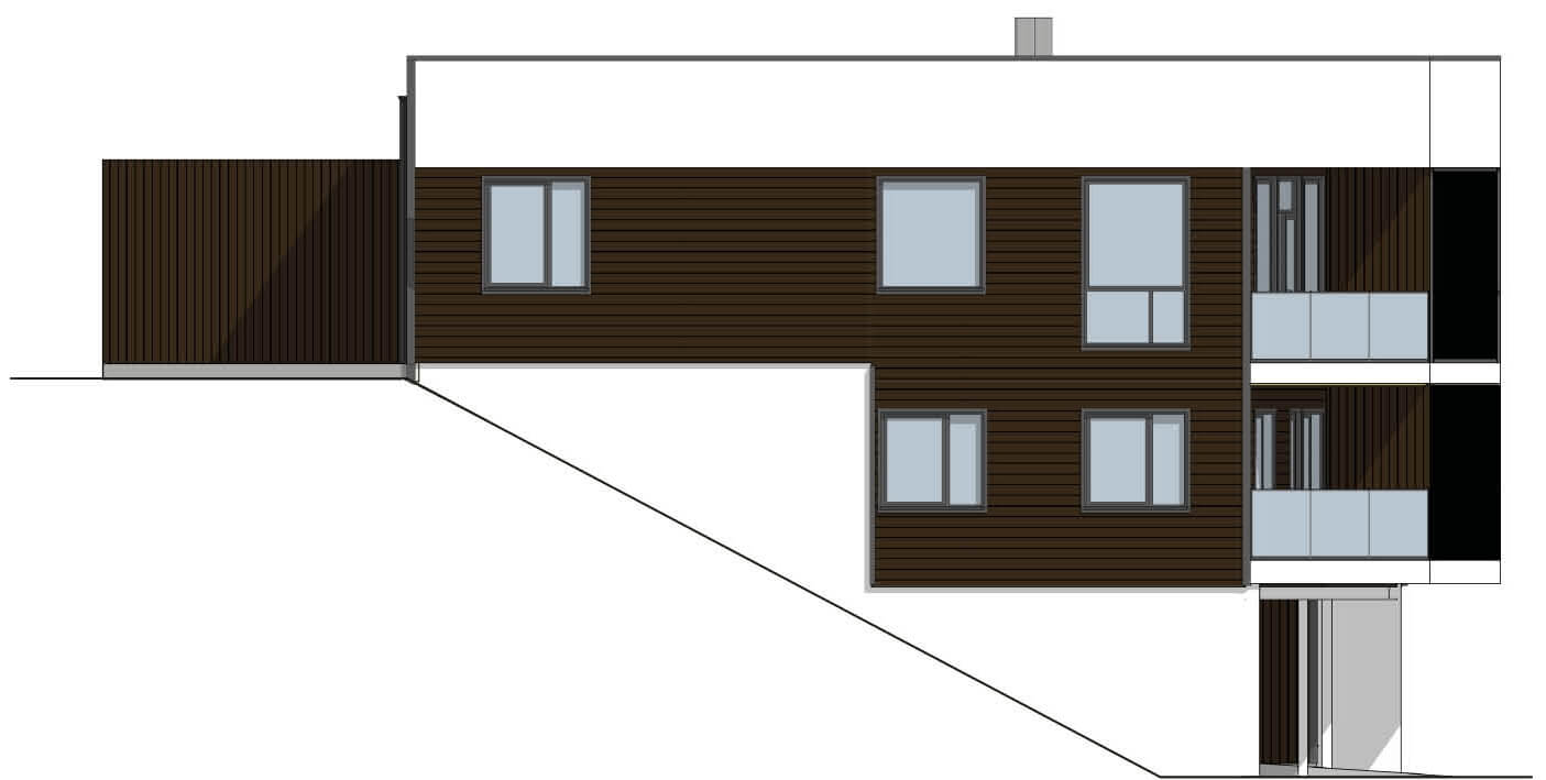 Bolig 1105 er beregnet for bratte tomter med flott utsikt. I denne romslige boligen er det satt av plass til løfteplattform for å oppfylle ønske om tilgjengelighet. I alle etasjene har man tilgang til uteområde og veranda. Mens man i toppetasjen også har tilgang til terreng på baksiden av bygget, har man i forkant et stort og lyst stue-kjøkkenrom med store vindusflater som slipper inn mye naturlig lys samt lar deg nyte utsikten.