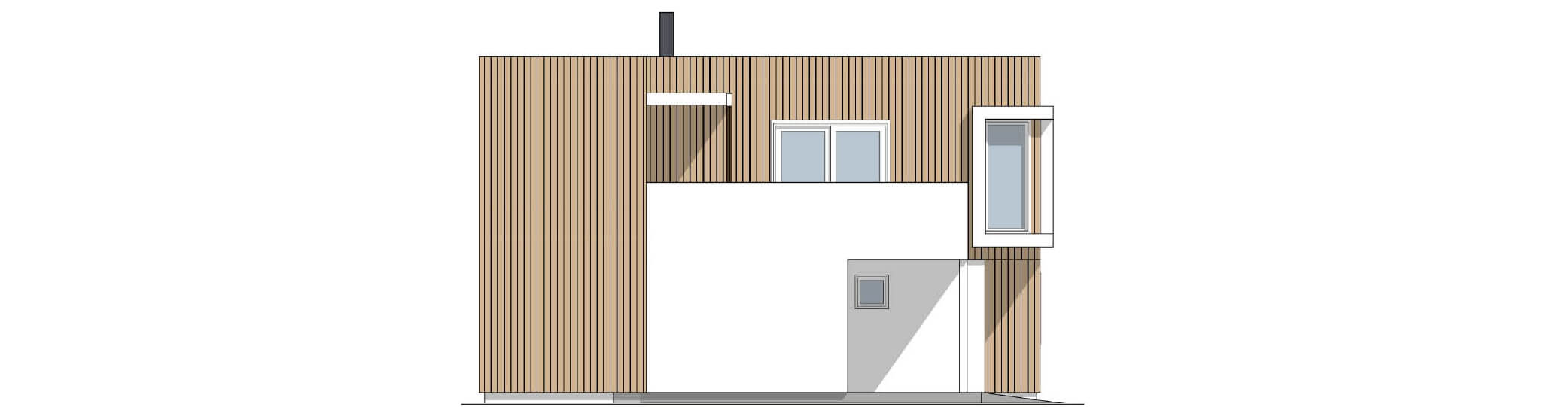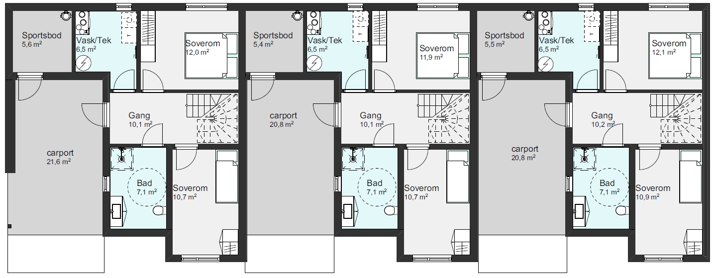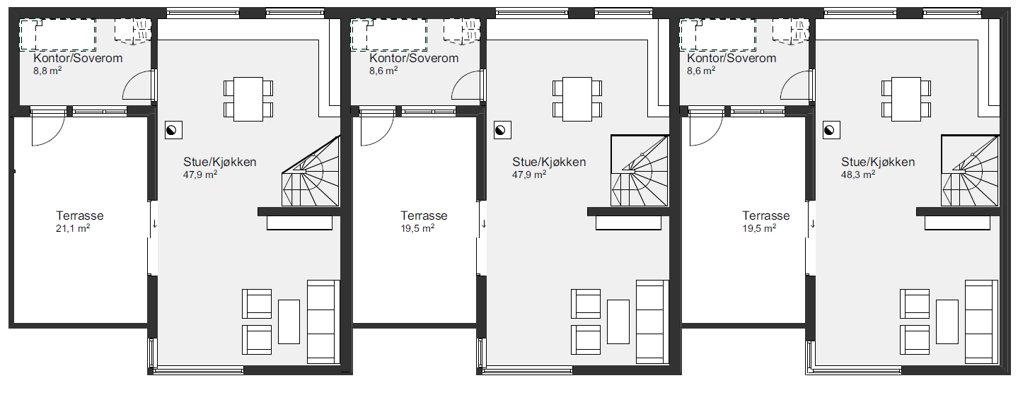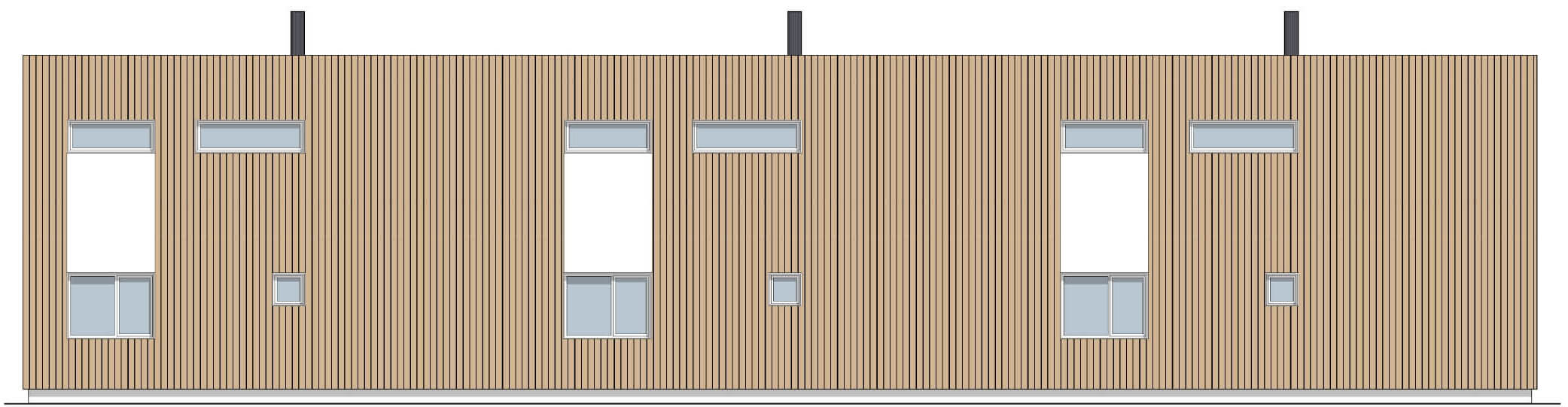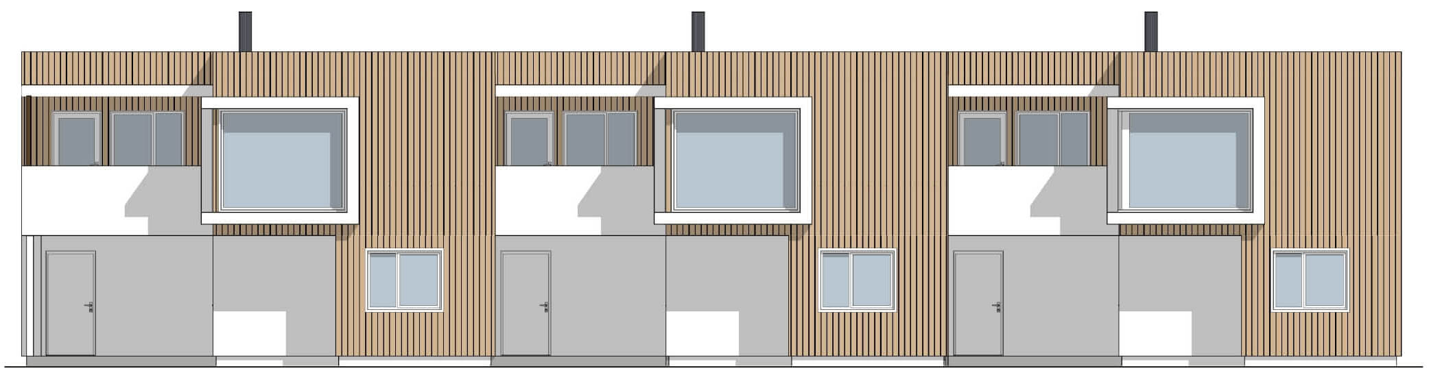 En kompakt bolig med integrert carport og stor terrasse. Her har man stor fleksibilitet når det gjelder antall enheter. Om man ønsker flere enheter i rekke, har man muligheten til det. Elementer som glatte veggflater sammen med stående kledning gir enhetene et stilrent og moderne uttrykk.