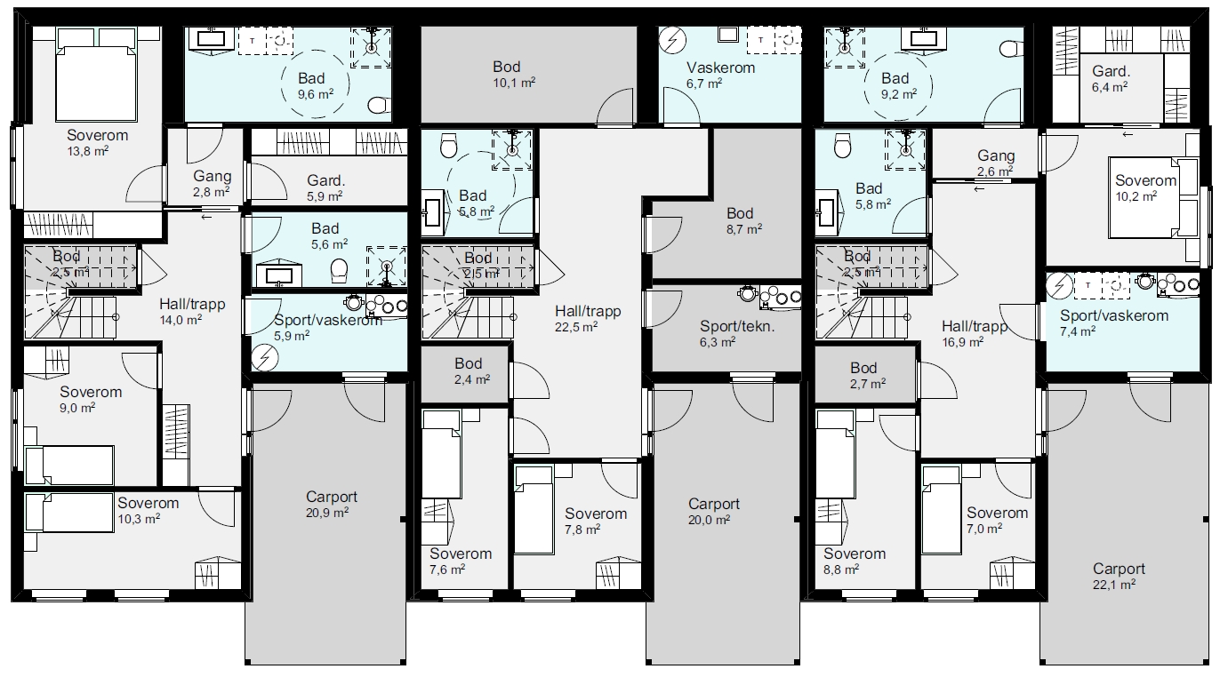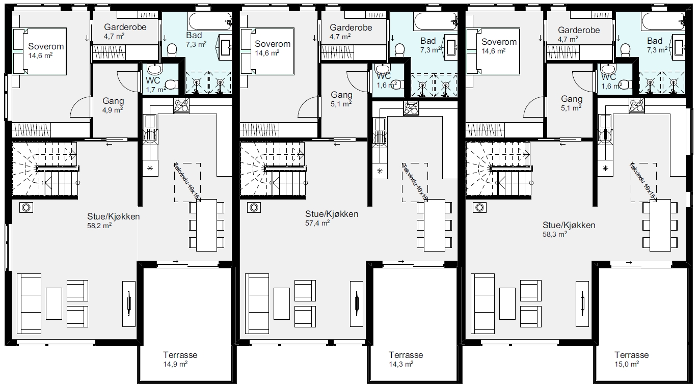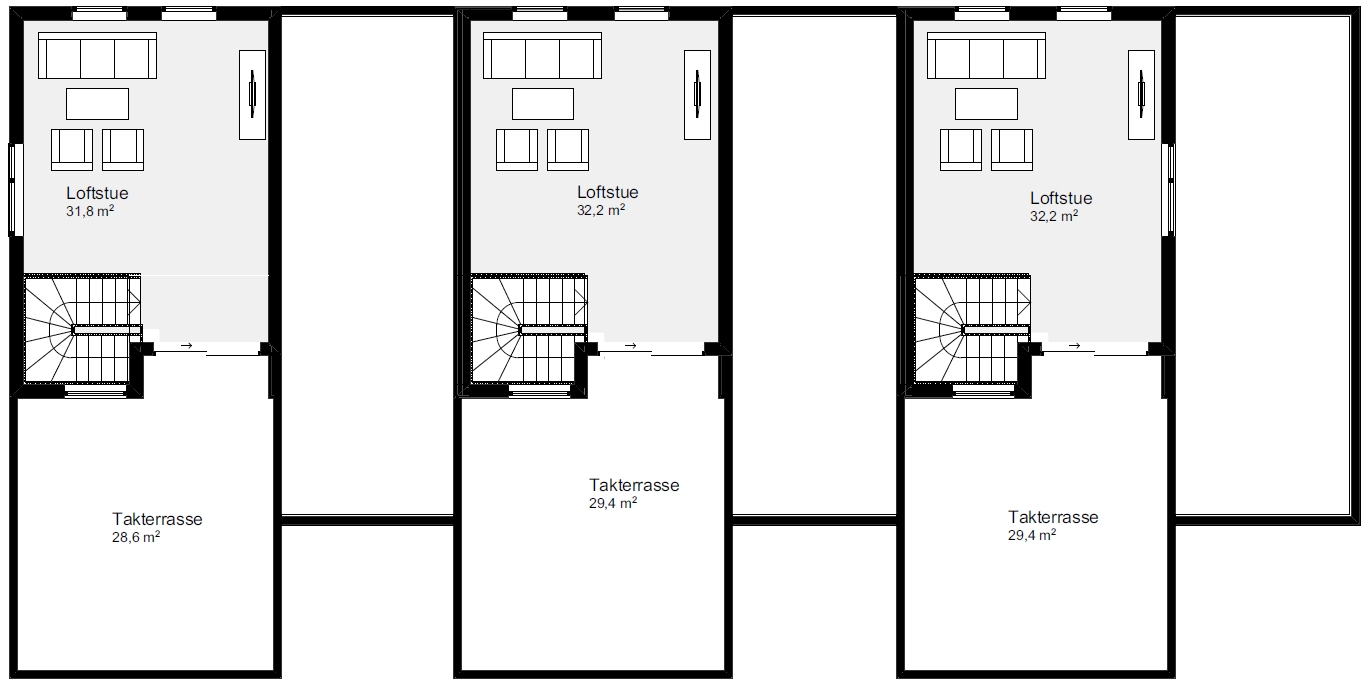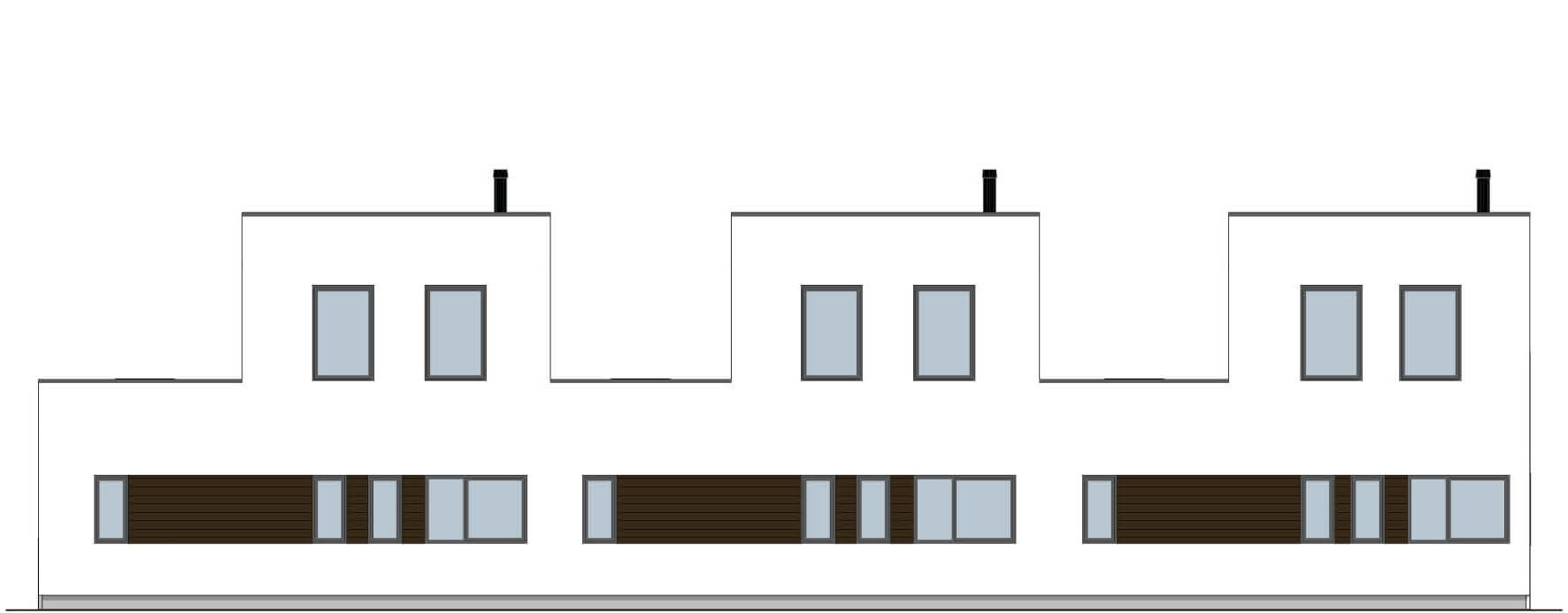 Bolig 1107 er basert på eneboligen LUNA plassert i rekke. Dette er en romslig bolig med moderne arkitektur og spennende bruk av byggematerialer. På denne modellen står man fritt til å velge antall enheter man ønsker, ut fra forholdene på tomten. Terrasser utenfor både kjøkken og loftstue, gir boligen det lille ekstra.