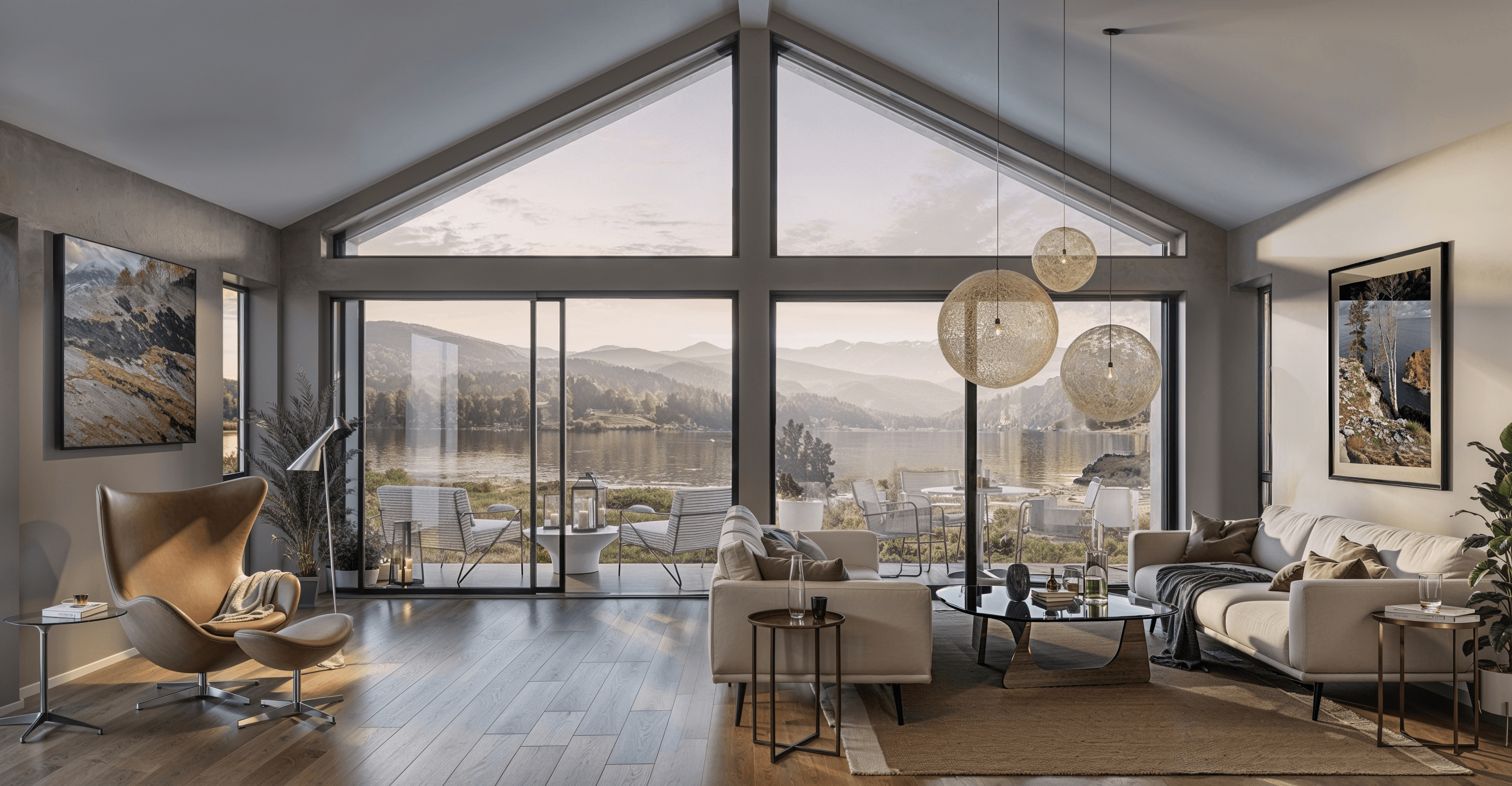 Vega har alt du trenger på ett plan. Med storslåtte vinduer som strekker seg fra gulv til tak, inviteres de naturlige omgivelsene inn i stua og skaper en følelse av åpenhet.