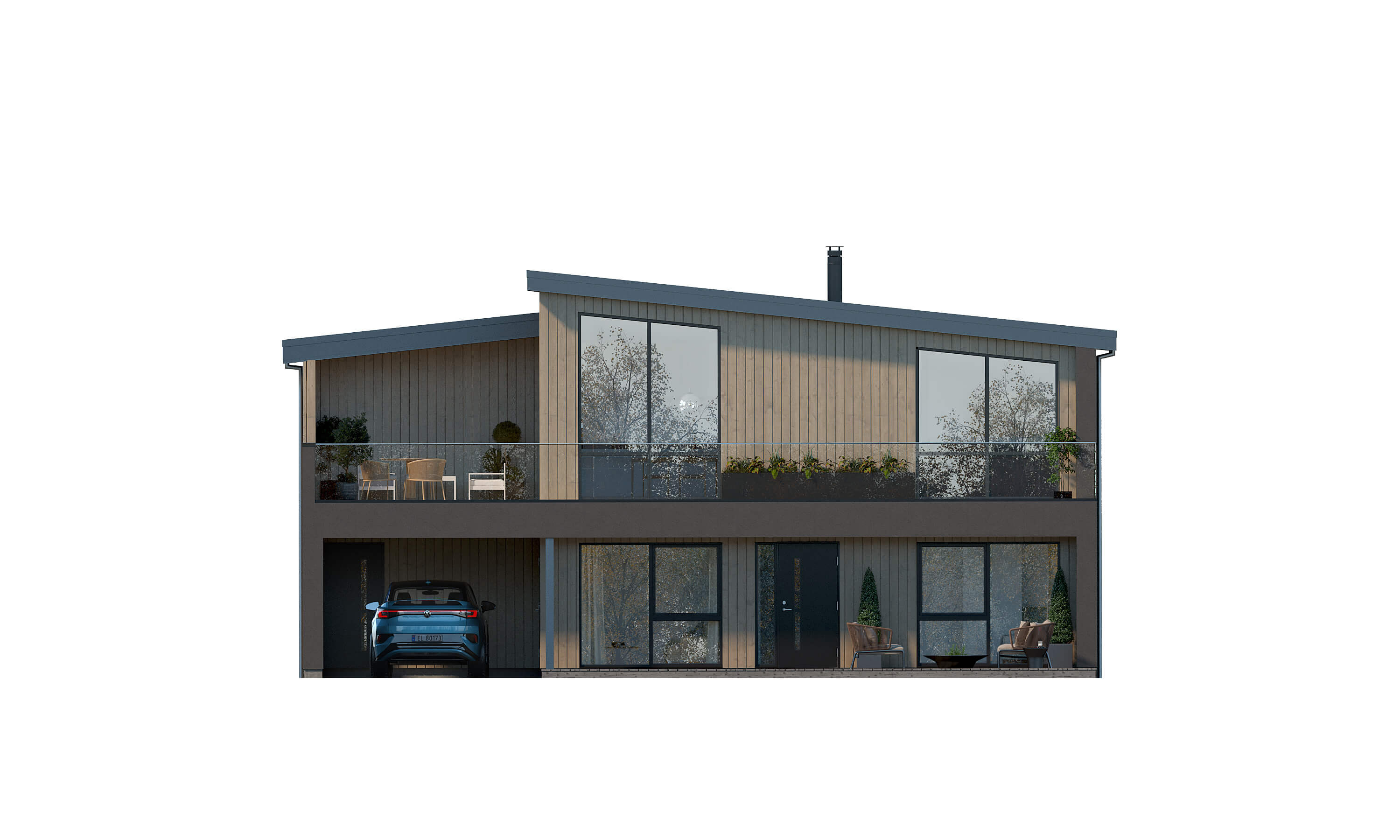 Med Faro får du en særpreget funkisbolig, med en herlig altan og integrert carport. Store vindusflater og en skrå himling skaper et åpent og luftig preg.