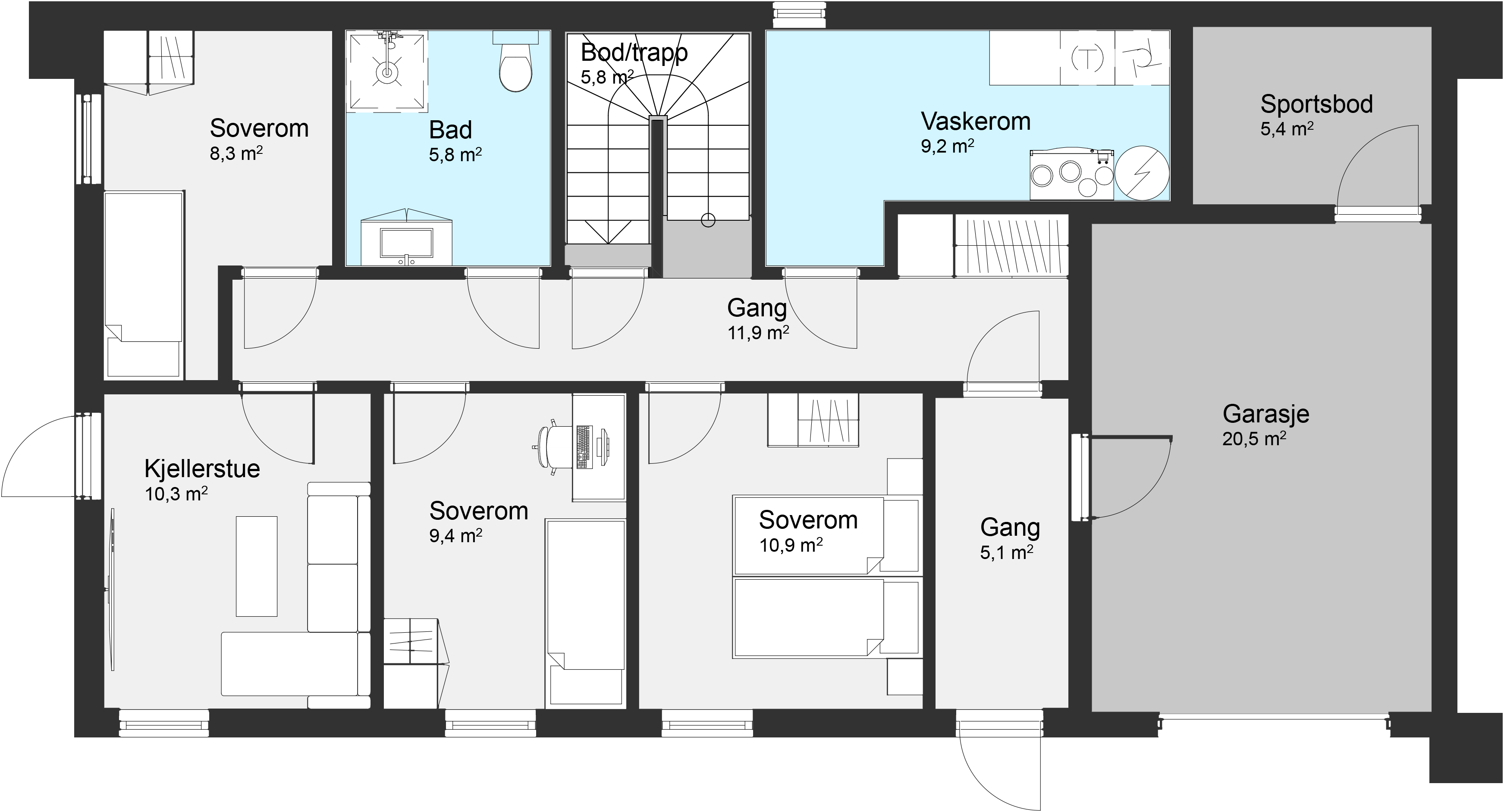I første etasje finner du tre av soverommene, bad, vaskerom og en koselig kjellerstue. Hovedetasjen byr på en åpen stue- og kjøkkenløsning med store vindusflater som slipper inn rikelig med dagslys. Her ligger også hovedsoverommet, med walk-in garderobe og eget bad.