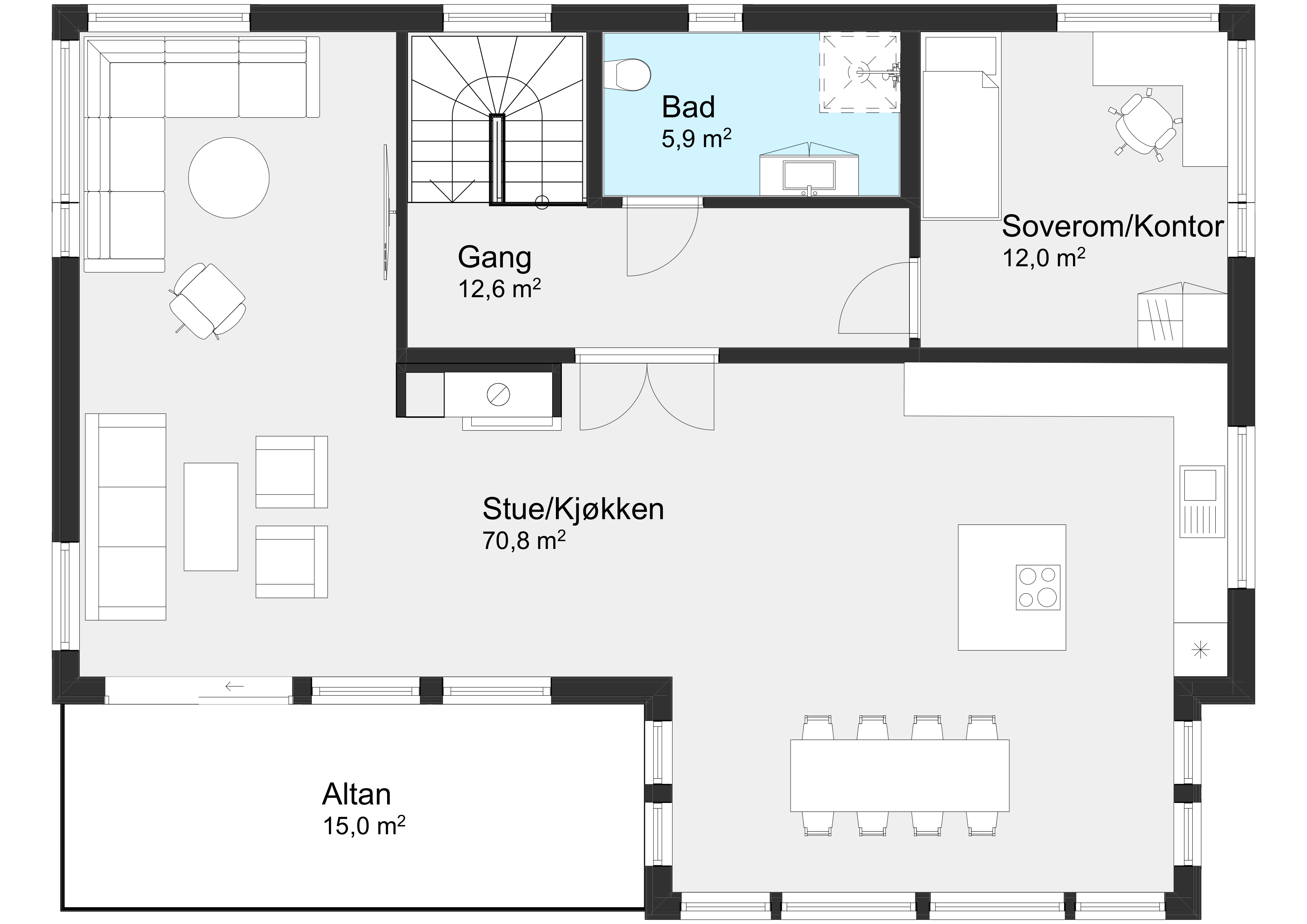 Huset er på hele 210 m², og byr blant annet på hele fire soverom, stor åpen stue- og kjøkkenløsning i tillegg til en ekstra stue. Alnes er perfekt for deg som vil samle venner og familie over en herlig middag, enten i det åpne sentrum av hjemmet, eller på altanen.