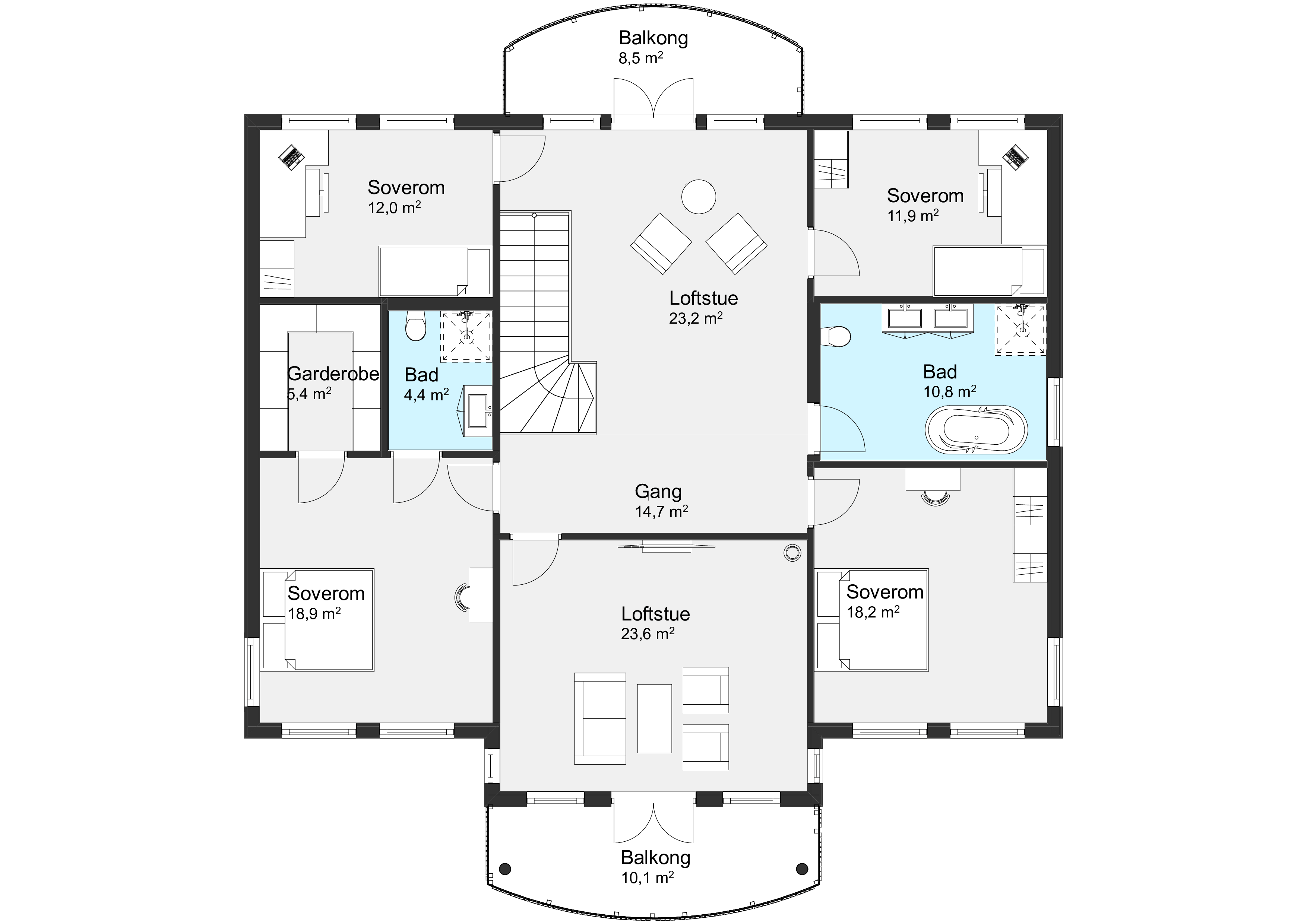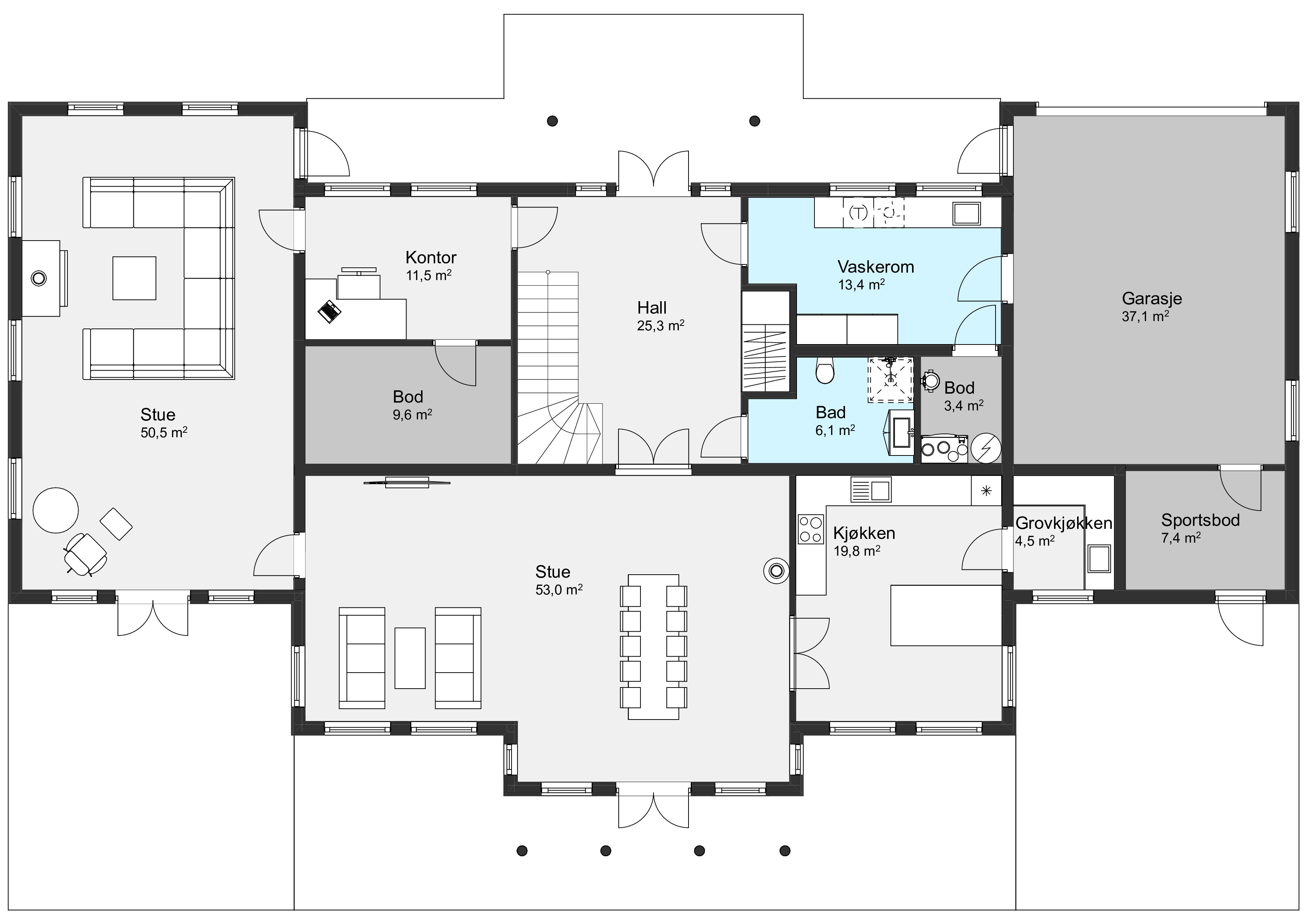 Boligen kan bygges med eller uten sidefløyer, noe som gir deg stor frihet til å forme hjemmet over tid. Kanskje du planlegger én fløy nå, og en annen senere – etter hvert som familien vokser og behovene endrer seg. Modulene kan inneholde alt fra ekstra stuer og soverom til egne innganger, utleiedeler eller en romslig garasje med direkte adkomst til boligen. Uansett hva du drømmer om, kan Borgund tilpasses dine visjoner – enten du vil ha en herskapelig bolig med klare linjer eller et moderne familiehjem med mange soner og funksjoner.